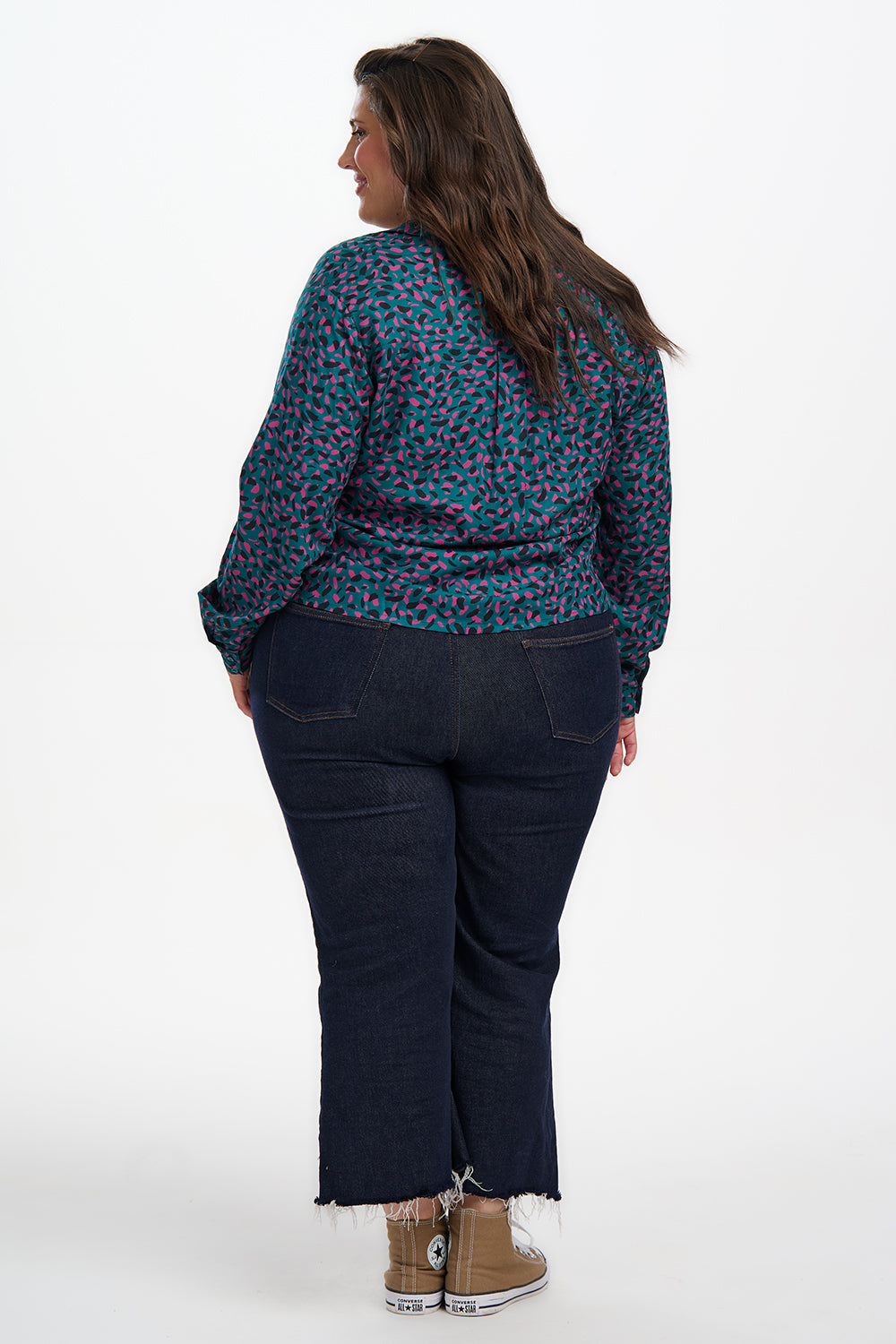 Effortlessly stylish, this loose-fit revere collar shirt channels a relaxed, pajama-inspired silhouette. Designed with a soft open neckline, back yoke, and wide buttoned cuffs on long sleeves, it’s perfect for both work and weekend wear. The bold abstract leopard print features scattered pink and black brushstroke spots against a rich deep teal background, adding a pop of colour to any outfit.