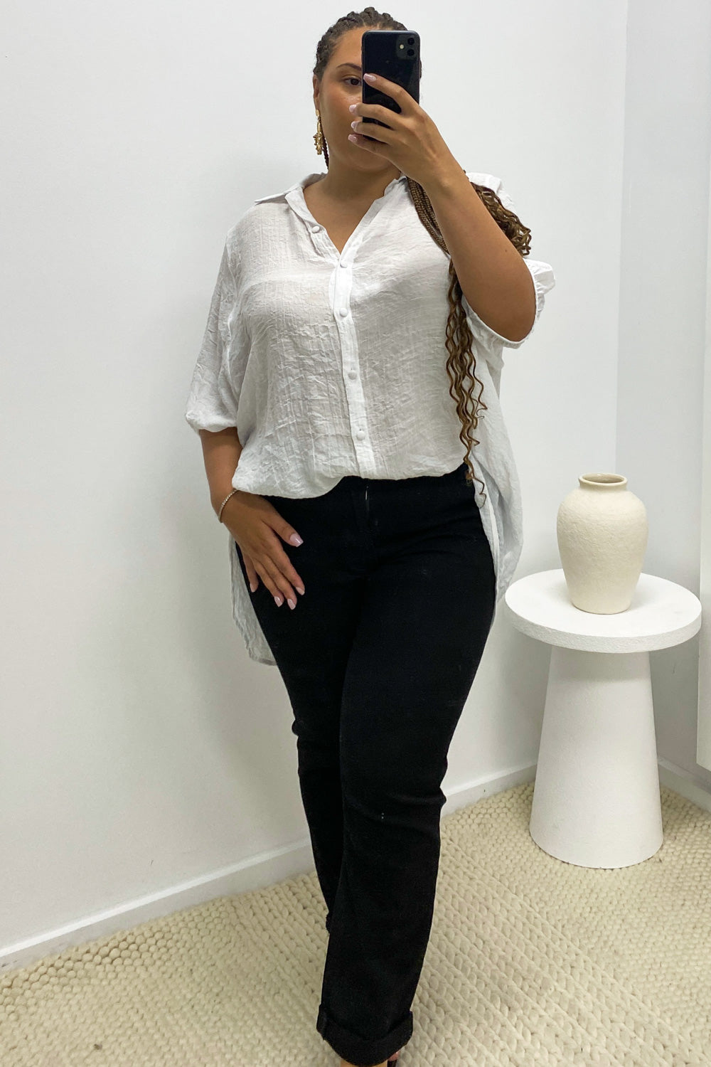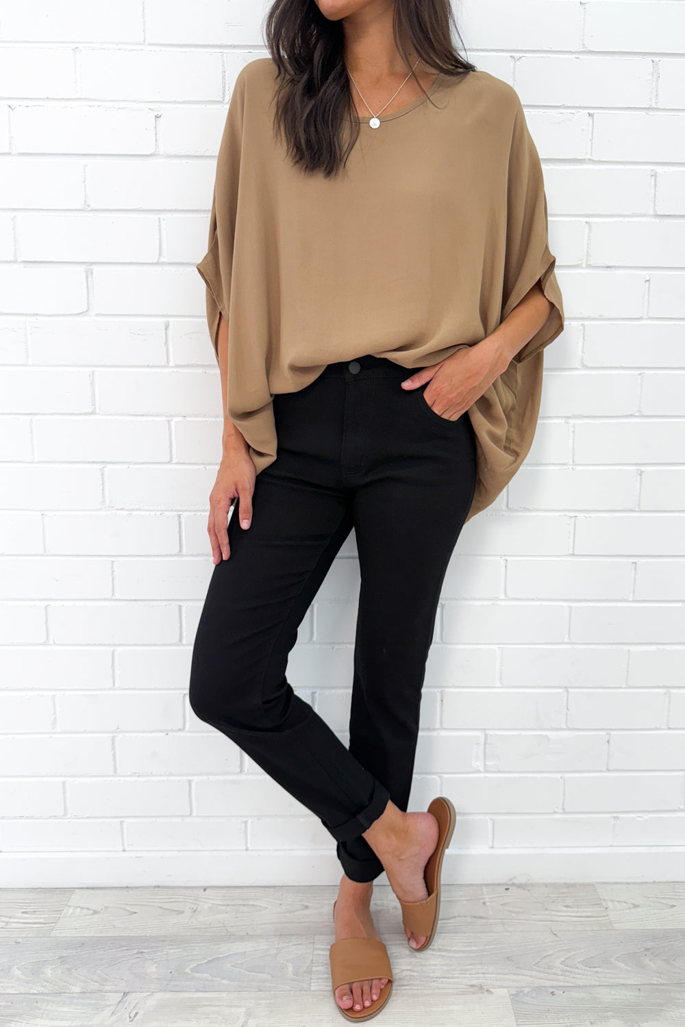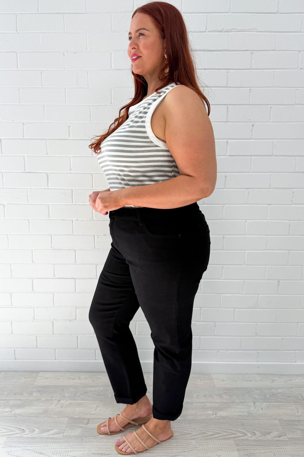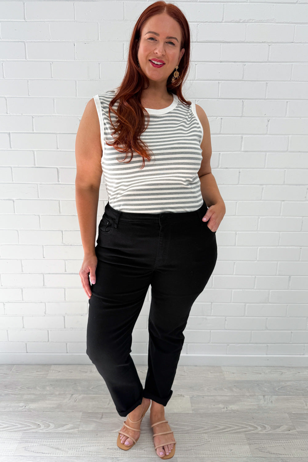 A classic mum jean, and mums are babes, hence the name. Another classic shape and fit, but different to the others. They sit on the belly button, they are a straight leg, and they look really good as is, and cuffed. They're a bit stretchy, but we recommend your normal size so they have that relaxed look. They're just good.