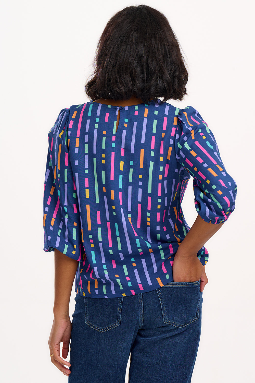 Looking for an easy top with a fun twist? The Wendy’s got you covered. With its comfy, relaxed fit and playful 3/4 blouson sleeves, this everyday favourite pairs perfectly with your go-to jeans. The real star? Our Blue Broken Lines print –vibrant, flickering horizontal lines in shades of purple, pink, green, and orange, all set against a rich dark teal blue backdrop. It’s eye-catching, vibrant, and adds instant colour to any outfit.